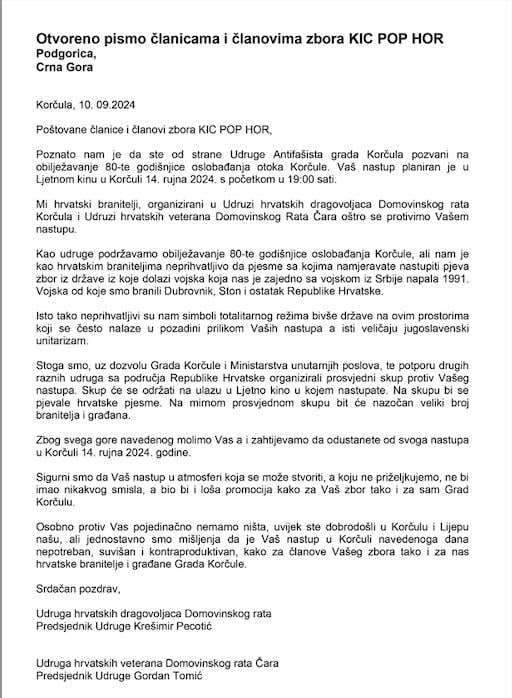 "Kao udruge podržavamo obilježavanje 80. godišnjice oslobođenja Korčule, ali nam je kao hrvatskim braniteljima neprihvatljivo da pjesme s kojima namjeravate nastupiti pjeva zbor iz države iz koje dolazi vojska koja nas je zajedno sa vojskom iz Srbije napala 1991. Vojska od koje smo branili Dubrovnik, Ston i ostatak Republike Hrvatske", piše u otvorenom pismu koje potpisuje i predsjednik UHDDR-a Čara.